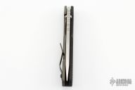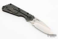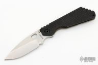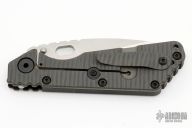 This SMF framelock folder by Mick Strider features a stonewashed spear point blade and a dimple pattern black aluminum and flamed titanium frame and tip up titanium clip. Includes a "Lock Bar Stabilizer" for maximum reverse lock retention. Nice detent, lockup and blade seating. Excellent condition.