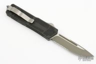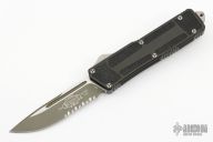 This QD Scarab by Microtech Knives features a two-tone OD green blade with fullers and partially serrated edge. The handle is aluminum with non-slip inserts, tip down SS clip and glass breaker. Comes with a Microtech box and papers. S/N 0789 and dated 04/2003. Has some light scuffs and scratches, otherwise excellent condition.