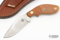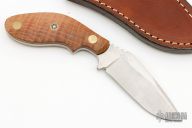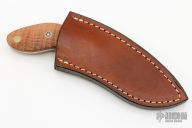 This Push Knife by Daniel Koster features a satin finished drop point blade with notched thumbrest, .159" blade stock and 1.082" blade depth, full tang construction. The handle has maple scales with black liners, mosaic and brass pins. Includes a brown leather sheath. Has some light scratches, otherwise excellent condition.