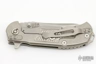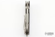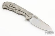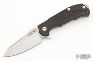 This MP-1 by Rick Hinderer Knives features a stonewashed blade with notched thumbrest, dual thumbstuds and flipper. The handle has an black G-10 scale and stonewashed titanium frame with a matching clip that can be positioned for tip up or down carry. The MP-1 also features Hinderer's new HMBS (Hinderer Modular Back Spacer). Has been resharpened, excellent condition.
