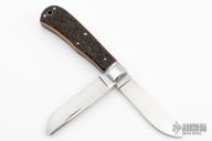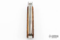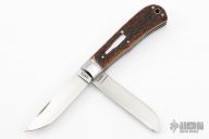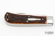 This Remington Bullet from Mr. Ohta features two hand rub satin finished blades with nail nicks. The handle has polished and fluted stainless steel bolsters, jigged bone covers with stainless steel bullet escutcheon, stainless steel liners and springs that are flush in the closed, half-stop, and open positions. Has a few light scratches, otherwise excellent condition.