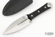This SBD by Microtech Knives and Borka Blades features a stonewash finished double-edged blade with one fully serrated edge, .188" blade stock and 1.556" blade depth, full tang construction with black G-10 scales. Comes with the original kydex sheath, box and papers, dated 08/2022 s/n 2219. Excellent Condition.