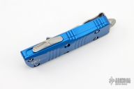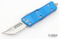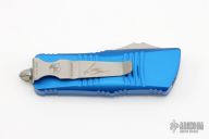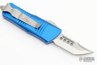 This Troodon Mini Hellhound OTF automatic by Microtech knives features a stonewash finished single edged blade, and a blue aluminum handle with bead blasted hardware, tip down carry. Glass breaker. S/N 305. Dated 01/2023. Comes with original box and papers. Excellent condition.