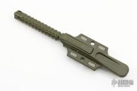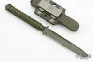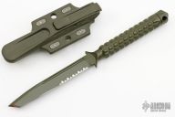 This ADO by Microtech knives is made from a single steel billet. Green single edge tanto blade with textured handle. .189" Blade Stock. .65" Blade Depth. Removable end cap with small storage area. Sheath with belt clip. Dated 02/2012. Includes original sheath. Has light scuffs and scratches, great condition otherwise.