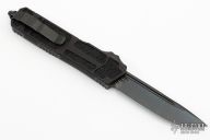 The Microtech Scarab II is a high quality tactical out-the-front knife, based on the original Microtech Ultratech design. Built to withstand the extreme, the Scarab II excels in high-intensity covert operations. The Scarab II is designed for a broad spectrum of utility and close quarter combat applications for use by qualified law enforcement, military, and government agency operatives. The Scarab II is fabricated to the highest possible standards to assure reliability and safety with its use. Featuring a one-handed, open and close, dual-action out-the-front (OTF) design, and double edge blade. The Scarab is produced with a large easy-to-grip handle that contains non-slip grip inlays on both sides. Comes with original box and papers. Excellent condition.