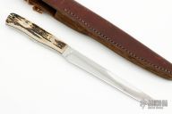 This Carving Knife by Parham (please let us know if you know this makers first name) features a mirror polished blade with .134" blade stock and .903" blade depth, full tapered tang construction. the handle has stag scales with black liners. Comes with a brown leather sheath. Has some light scratches, otherwise good condition.
