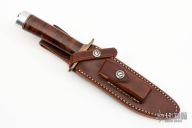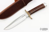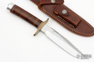 The Model 1 Fighter by Randall Made Knives has a satin finished blade with sharpened top edge, .190" blade stock and 1.190" blade depth, hidden tang construction. The handle has a brass double guard, stacked leather grip with red/white/blue spacers, duralumin butt. Comes with a brown leather sheath. Has few light scratches, otherwise excellent condition.