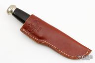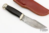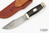This Hunter by Charlton LTD features a Damascus blade with notched thumbrest, .181" blade stock and 1.325" blade depth, hidden tang construction. The handle has nickel silver guard and butt, black wood grip with nickel silver escutcheon. Comes with a brown leather sheath by Lawrence USA. Has a couple light scratches, otherwise excellent condition.