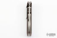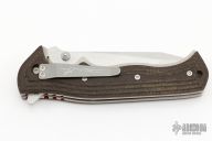 This Tighe Chee by Brian Tighe features a nicely ground tanto blade with a hand rub satin finish. Well-contoured "cracked ice" titanium frame with grip enhancing sculpted canvas micarta overlays. Red liners. Thong hole in the handle. Smooth action with thumbstud and flipper. Solid lockup, nice detent. Has some scratches on the blade, and a couple scuffs on the clip. Excellent condition otherwise.