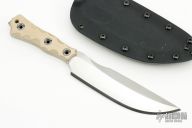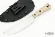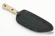 This knife by American Kami has a hand rub satin finished chisel ground blade with full tang and false top edge, .207" blade stock, 1.660" blade depth. Handle has tan G-10 scales with exposed tang butt/glass breaker, and lanyard hole. Has some sheath scratches, otherwise excellent condition. Comes with a kydex sheath.