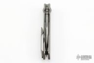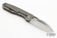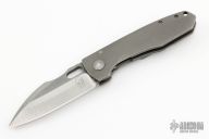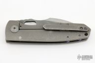 This EDMW Variant from Steve Karroll features a CPM3V two-tone finished blade with satin grinds and tumbled flats, notched thumbrest, and thumbhole. The handle has an orange peel finished titanium frame and a tumbled titanium clip positioned for tip up carry. Has blue anodized standoffs, and hardware. It has nice detent, blade seating and lockup. Pivots on caged bearings. Has some light scratches near the tip of the blade and shows some small scuffs on the frame and clip. Otherwise good condition.