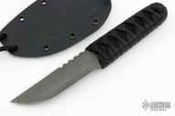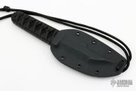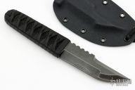 This Kwaiken Neck Knife by Sam Eddleman features a blackwashed multiground blade with sharpened top edge and notched thumbrest, .241" blade stock and .896" blade depth. Handle is wrapped in a traditional Japanese style using epoxy soaked nylon cord over rayskin. Comes in a custom black kydex neck sheath. Excellent condition.