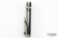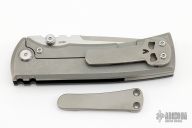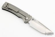 This Chaves Ultramar Redencion Drop Point features a satin finished blade with the Chaves logo, dual thumbstuds, and notched thumbrest. The handle is made up of a black G10 scale, tumbled titanium skull pocket clip (positioned for tip up carry), and a matching titanium backspacer. Has overtravel stop. Blade is centered when closed, and locks up with no play. Comes with box and additional clip. Excellent Condition.