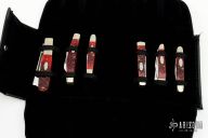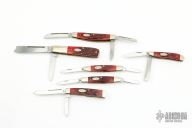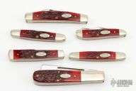 These knives all have mirror polished blades with single nail nicks. The handles have nickle silver bolsters abd red jigged bone covers over brass liners. Includes a black leather case. Excellent condition.
