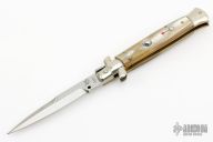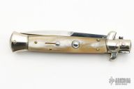 This swivel bolster auto by Latama features a spear point blade with a false top edge. Nickel silver guard and rear bolster and French horn tip scales. Nice function, strong firing and lock up. Excellent condition.