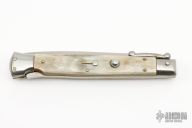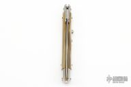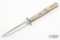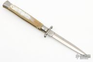 This 11" Swing Guard Auto by Frank Beltrame features a dagger ground blade with false top edge. The handle has stainless steel bolsters, front and rear, honey horn scales, brass liners, stainless spring. Excellent condition.