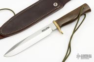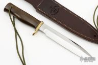This Model 16 Diver by Randall Made Knives features a satin finished blade with sharpened top edge and notched thumbrest, .215" blade stock and 1.093" blade depth, full tang construction. The handle has a brass guard, green linen micarta grip. Comes with a waxed brown leather sheath. Excellent condition.