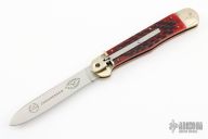 This leverlock auto by Hubertus features a spear point blade, nickel silver bolsters, jigged bone scales, and brass liners and pins. Opens with a nice snap. Very fast opening. Has some patina and light scratches, otherwise great condition.
