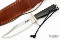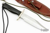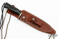 This Buxton Fighter by Randall Made Knives has a satin finished blade with sharpened clip, .201" blade stock and 1.440" blade depth, full tang construction. The handle has a nickel silver guard, black linen micarta handle. Comes with brown leather sheath. "BF 502" on blade. Excellent condition.