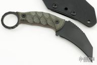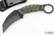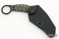 This Karambit by Half Face Blades features a black cerakote chisel ground hawkbill blade with notched thumbramp, .144" blade stock and 1.394" blade depth, full tang construction. The handle has micarta scales with black hardware, ring at the butt. Comes with kydex sheath with belt clip. Has a couple light sheath scuffs, Excellent condition.