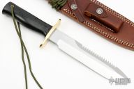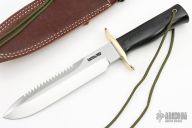 The Model 14-7.5 by Randall Made Knives features satin finished blade with sawteeth, .220" blade stock and 1.366" blade depth, full tang construction. The handle has a double brass guard, and black linen micarta grip with a lanyard hole. Comes with original brown leather sheath and paper wrapping. New from maker.
