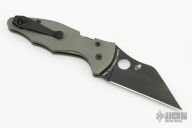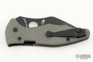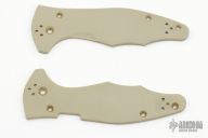 This Yojimbo 2 by Spyderco features a black finished wharncliffe blade with thumbhole. The handle has a tan G-10 frame with stainless steel liners, lock is on the spine of handle. 4-way reversible stainless steel clip. Nice detent, lockup and blade seating. Attached are bead blast finish titanium scales and deep carry clip. Comes with original box, scales, and papers. Excellent condition.