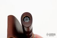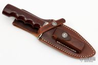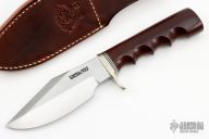 This Model 19-5 by Randall Made Knives features a satin finish clip point blade with sharpened top edge and notched thumbrest, .202" blade stock and 1.724" blade stock, hidden tang construction. The handle has a nickel silver guard, a compass in the butt and a maroon linen micarta grip with black/duralumin spacers. Includes a brown leather sheath with belt loop and original paper wrapping. New from maker.