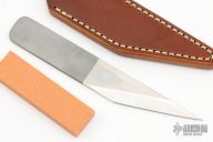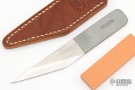 This Kiridashi style "tailor's" knife by Randall Made Knives features a satin finished blade with notched thumbrest, .110" blade stock and .918" blade depth. Non-catalog Randall item. Comes with a brown leather slip sheath. Hard to find. Comes with original papers wrapping. New from maker.