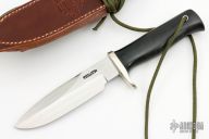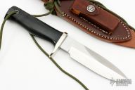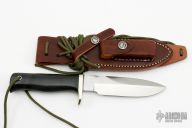 This Combat Companion by Randall Made Knives features a satin finished blade with sharpened top edge, .170" blade stock and 1.189" blade depth, full tang construction. Black linen micarta handle and nickel silver guard, lanyard hole at the butt. The Combat Companion is one of Randall's non-catalog knives. Includes a brown leather sheath and original paper wrapping. New from maker.