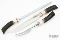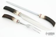 "Designed to meet every requirement as the ideal table knife, it is rustproof and will resist staining as ordinary blades do when used in carving meat. Complete with high-quality stag handled Sharpening Steel and Fork. A three-compartment felt case is included. " Satin finished blade with .168" blade stock and 1.215" blade depth, hidden tang construction. Nickel silver guards with stag grips and red/white/blue spacers. Comes with cloth rollup, and original paper wrapping. New from maker! Note: The carving set should not be placed in a dishwasher.