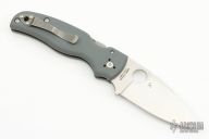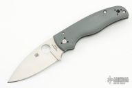 The new BladeOps Exclusive Spyderco Shaman features a gray G-10 handle, skeletonized stainless steel liners, a satin finshed leaf shaped ELMAX blade, and Spyderco's trademark round hole opening feature.