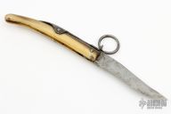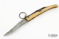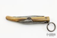 This Mini Navaja by Tarry Levigne has a recurve blade with nail nick. The handle is a single piece of horn with a steel ring lock mechanism on the spine. Has some patina and scratches, otherwise good condition for its age.