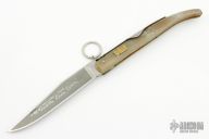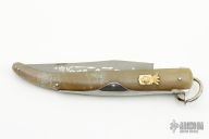 This Vintage Navaja by Le Sabot features a clip point blade with nail nick. The handle has horn scales with a stainless steel spring and ring lock mechanism. Has some light scratches and patina, otherwise good condition.