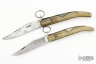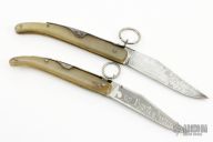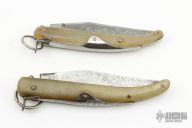 These Vintage Navajas feature clip point blades with nail nicks. The handles are horn with a steel spring and ring lock mechanism. Has some scratches and patina, otherwise good condition for their age.