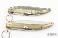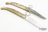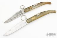 These Vintage Navajas feature clip point blades with nail nicks. The handles are horn with a steel spring and ring lock mechanism. Has some scratches and patina, otherwise good condition for their age.