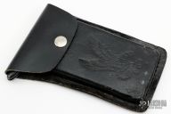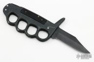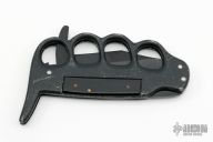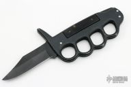 This knuckle knife lockback folder was made in Japan. Kindof looks like a Taylor Cutlery or Valor product, but it isn't marked as such. Black blade. Black metal handle with black inlays. Has scratches/scuffs/wear, otherwise fair condition for its age. Comes with a black leather belt sheath.