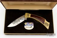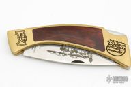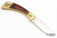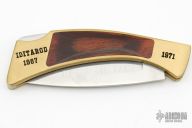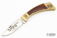 This lockback folder by Browning was made to commemorate the 1987 Iditarod, it is #1971 of 2000. It features a mirror polished blade with nail nick. The handle has a brass frame with wood inlays and a stainless steel backspacer. Comes with original box and pin. Excellent condition.