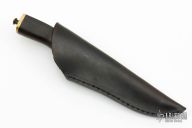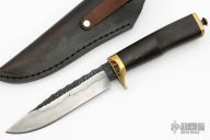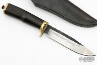 This Jurrasic Hunter by Murad Custom Knives features a hand rub satin finished blade with nice hamon and carved flats, blade spine and ricasso, .178" blade stock and 1.090" blade depth, hidden tang construction. The handle has a carved brass guard and a Japanese Rosewood grip, brass butt with a steel tang nut. Comes with a brown leather sheath and COA. New from maker.  This knife is a take down model and can be disassembled by removing the tang nut.