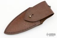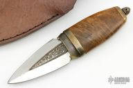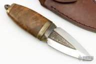 This EDC BabySpear by Murad Custom Knives features a hand rub satin finished double edged blade with carved center, .229" blade stock and 1.417" blade depth, hidden tang construction. The blade is SLD Hitachi Steel which is equivalent to D2. The handle has a brass guard and butt, stabilized teak burl wood grip, steel tang nut. Comes with a brown leather sheath and COA. New from maker.  This knife is a take down model and can be disassembled by removing the tang nut.