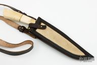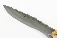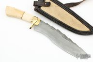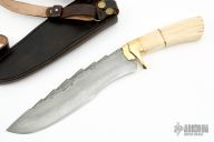 This Borgrim by Last Knives features a hand forged hand rub satin finished blade with a nice hamon and carved blade spine, SK3 blade steel, .250" blade stock and 2.169" blade depth, hidden tang construction. The handle has a brass guard and a mammoth ivory grip. Comes with a brown leather sheath with stingray skin inlay and COA. New from maker.