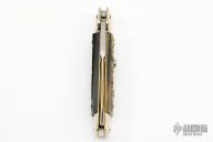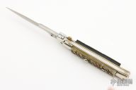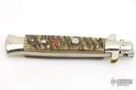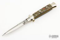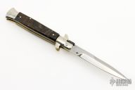 This auto by Latama features a polished spear point blade with a false top edge. Nickle silver guard and rear bolster and sheeps horn scales, brass liners, stainless steel backspacer. Nice function, strong firing and nice blade seating. Has a touch of blade play. Comes with zippered case. Has a couple very light scratches, otherwise excellent condition.