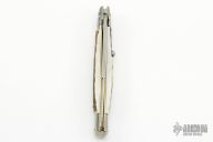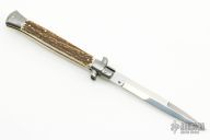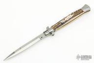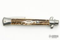 This 11" Swivel Bolster Auto by Frank Beltrame features bayonet dagger ground blade with false top edge. The handle has stainless steel bolsters, front and rear, stag scales, brass liners, stainless spring. Excellent condition.