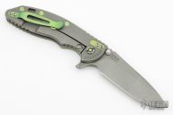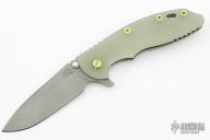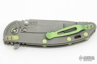 This XM-18 Flipper by Rick Hinderer Knives features a 3.5" stonewash finish blade, notched thumbrest and flipper, dual thumbstuds. The handle has a Jade Green G-10 scale, and stonewash finished titanium handle and green anodized finish hardware, filler tab, and titanium clip. Clip can be mounted for tip up or down carry. Nice lockup, seating, and detent. Comes with original box,. Excellent condition.