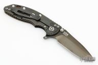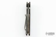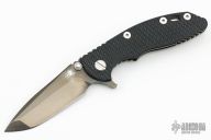 This XM-18 by Rick Hinderer features a DLC stonewash finished spanto blade with notched thumbrest and flipper. The handle has a DLC stonewash finished titanium frame, black G-10, satin titanium barrel spacers, bronze anodized liner, and a tip up or down reversible titanium clip and filler tab, lanyard hole at the butt. Comes with original box and hardware. Has a couple light scratches, excellent condition otherwise.