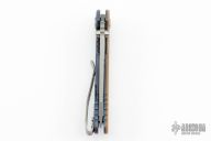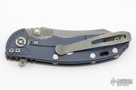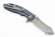 This XM-18 by Rick Hinderer features a stonewash finished blade with notched thumbrest and flipper. The handle has a tan G-10 front scale, anodize and stonewashed titanium frame, satin hardware, and a tip up or down reversible stonewash deep carry titanium clip and filler tab, lanyard hole at the butt. Comes with extra hardware for the clip. Has some marring on the hardware, some scratches on the frame and clip. Has some slight side to side blade play. Great condition otherwise.