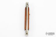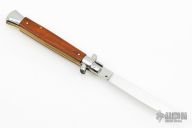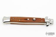 This 11" Picklock by Frank Beltrame features a mirror polished flat ground 4mm blade with false top edge. The handle has mirror polished stainless steel bolsters, front and rear, cocobolo scales, mirror polished brass liners and stainless steel spring. Excellent condition. This knife was professionally tuned and polished by Greg's Effects.