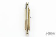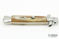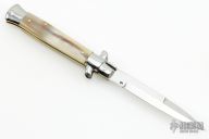 This 9" Picklock by Frank Beltrame features a mirror polished bayonet ground 4mm blade with false top edge. The handle has mirror polished stainless steel bolsters, front and rear, honey horn scales, mirror polished brass liners and stainless steel spring. Excellent condition. Comes with a leather belt sheath. This knife has been professionally tuned and polished by Greg's Effects.