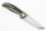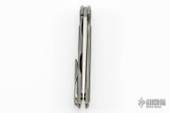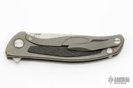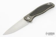 This Model 95 framelock from Shirogorov features a flat ground matte finished blade with notched thumbrest and flipper. The handle has a tumble finish titanium frame with carbon fiber inlays and a matching tip up clip and a single titanium barrel spacer at the butt along with a lanyard hole. Excellent lockup, strong detent, and nice seating. Comes with original box and cloth. Slight lockstick. Excellent condition.