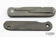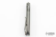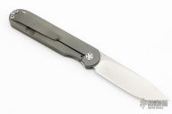 This Warlock Front Flipper by Gareth Bull features a tumble finished blade with notched thumbrest and front flipper. The handle has marble bead blast finish titanium frame and single anodized post. Rides on bearings, nice detent, lockup and blade seating. Comes with hard case, tool, and carbon fiber scale. Has a couple light scratches on the frame, some gunk in the finger grooves. Otherwise excellent condition.