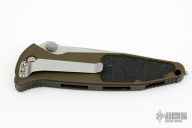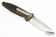 This Socom Elite manual linerlock folder by Microtech Knives has a partially serrated tanto blade with notched thumbrest and dual thumbstuds. Has a green aluminum handle with non-slip inlays, tip down stainless steel clip. Serial number 02523 and dated 08/2012. Has scuffs and scratches, some dings and dents, and has been resharpened. Good user condition.